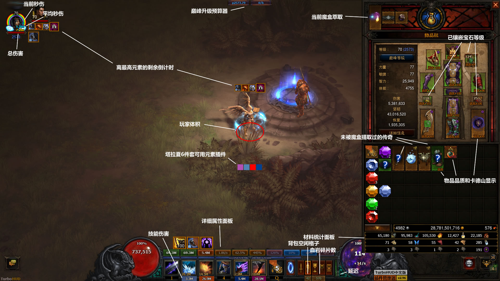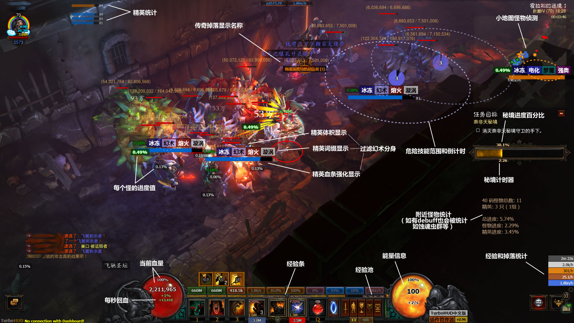 TurboHUD通过本地数据分析,并在游戏窗口上显示这些被分析得到的数据,其中包含强化显示(例如技能范围、怪物和玩家的体积、怪物debuff、精英血条等等),优化UI界面的显示(例如显示玩家名,各种怪物进度,塔名,地图名,精英词缀、技能和Buff倒计时、背包物品的相关信息显示等等),加强显示一些未被游戏展示的详细信息(例如显示已加载的地形,显示每种怪物的进度,显示附近怪物分布,显示附近大秘可能刷塔的位置,显示物品是否远古或太古,队友Buff的一些信息等等),显示一些统计信息(例如附近怪物总进度、经验和掉落统计、伤害统计、秘境相关时间统计、大秘刷塔记录统计、所有材料统计等等)及其他很多人性化功能